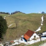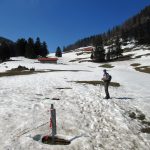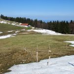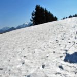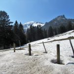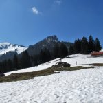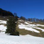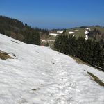 Los gehts beim Parkplatz Strehtrumpf oberhalb von Grassau. Ein Steig führt durch den Wald hinauf zur Pelzenalm, von wir aussichtsreich über Weidewiesen vorbei an der Hufnagelalm zur Rachlalm kommen. Über ein Schneefeld geht es weiter zur Staffnalm. Ein paar Leute sitzen auf, der Terrasse, von der man eine grandiose Aussicht ins Achental und auf den Hochgern hat, aber es ist Betriebsruhe – wie heute auch bei allen anderen sonst bewirtschafteten Almen. Wir rasten bei der Fahrnpointalm, da ist die Aussicht noch schöner, Brotzeit haben wir dabei.