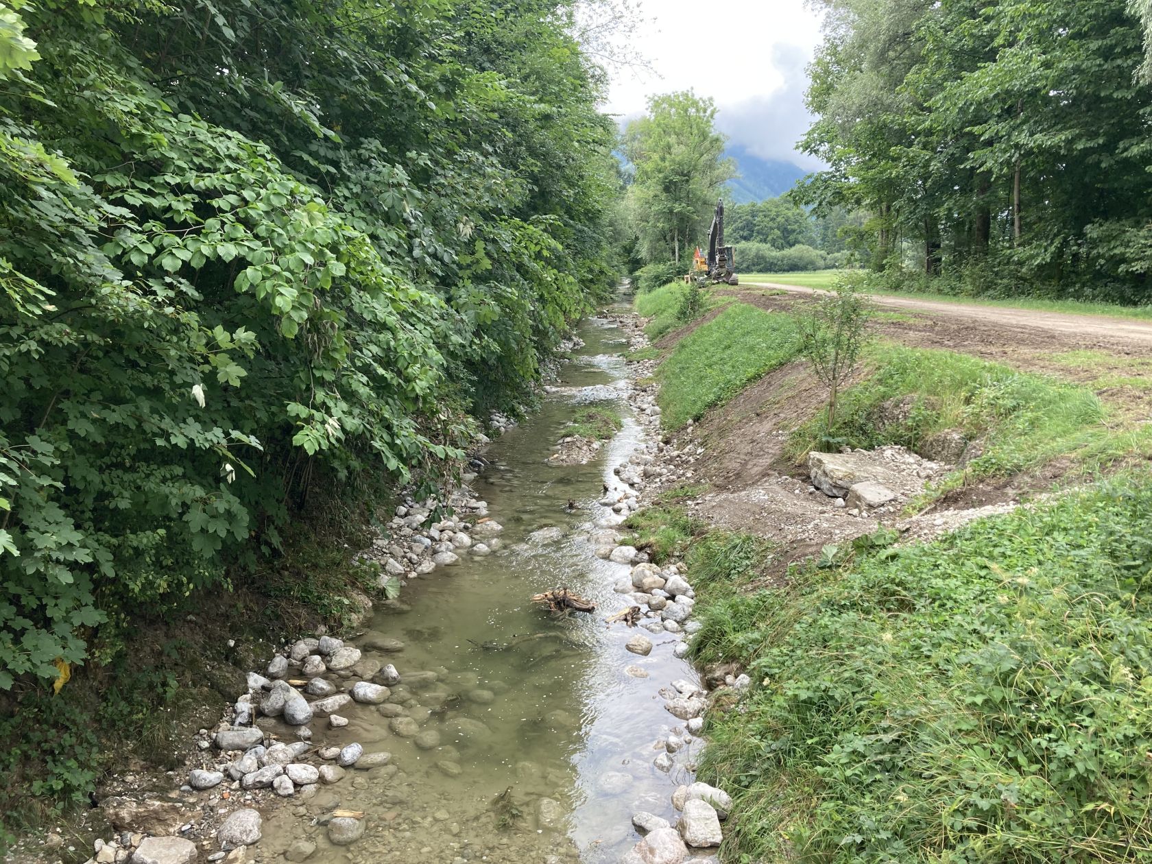 Der Wössener Bach ist aus seinem starren Korsett befreit. Das Ufer ist aufgelockert, die Holzbretter vom Grund des Baches sind verschwunden. Das Bachbett ist zu einer mäandernden Wasserrinne umgestaltet. Hier finden Fische nicht nur eine ausreichende Wassertiefe: Fischunterstände, aus Steinen gelegt, bieten ihnen ebenso Schutz wie Wurzelstöcke aus Totholz. Foto: Wasserwirtschaftsamt Traunstein