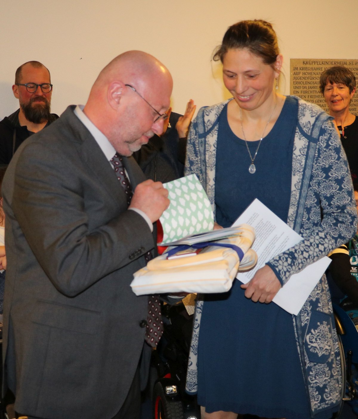 Die Vorsitzende der Personalvertretung Christine Ilsanker überreicht einen Satz Krankenhausbettwäsche zum häuslichen Eingewöhnen. Frau Cornelia Kuhn amüsierte sich königlich über dieses Geschenk.