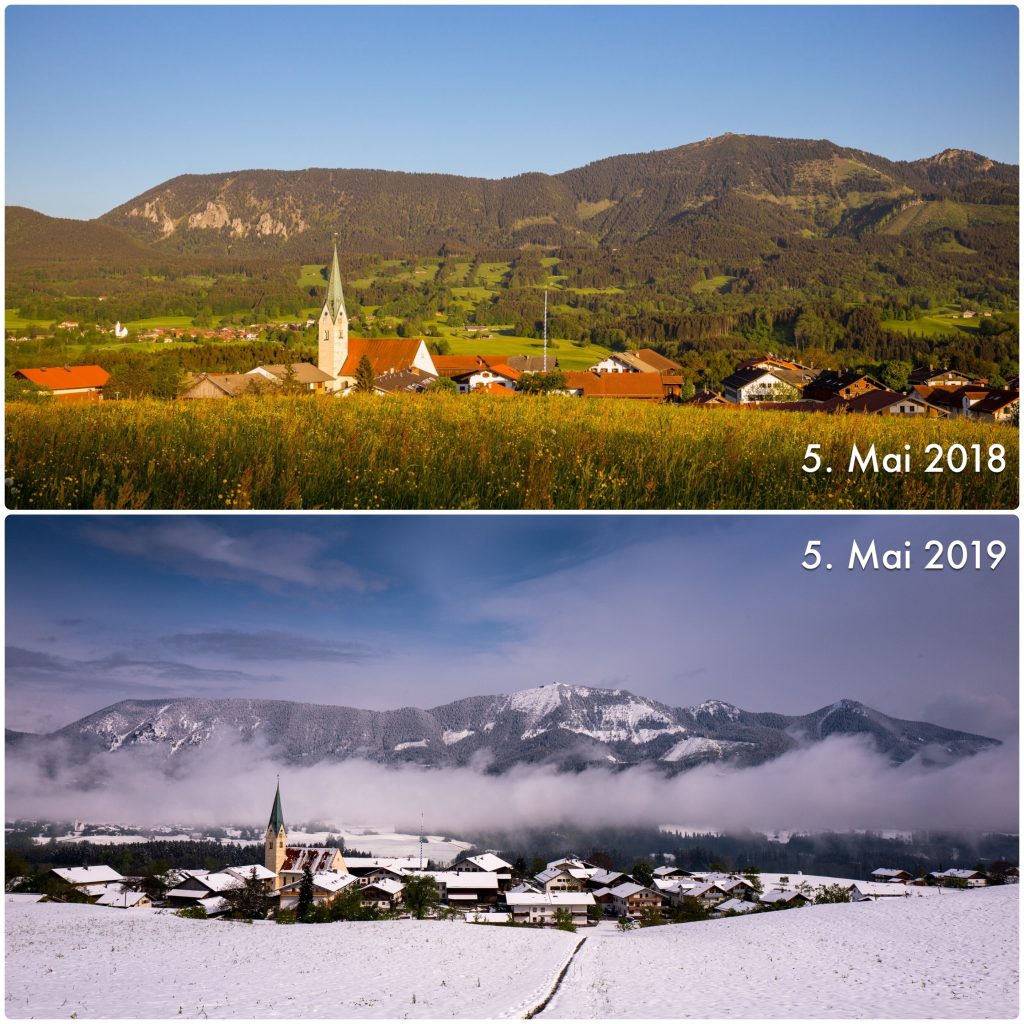 Kaum zu glauben: zwischen diesen beiden Aufnahmen liegt genau ein Jahr dazwischen. Jeweils am 5. Mai stand der Fotograf oberhalb von Törwang und schaute über den Samerberger Hauptort Törwang hinüber in die Hochries-Bergwelt. Während vor einem Jahr eher das Mähwerk angerückt kam, war heuer noch Verdacht auf den Schneepflug. Die Gegenüberstellung zeigt, wie unterschiedlich sich zum Frühjahr das Wetter entwickeln kann.