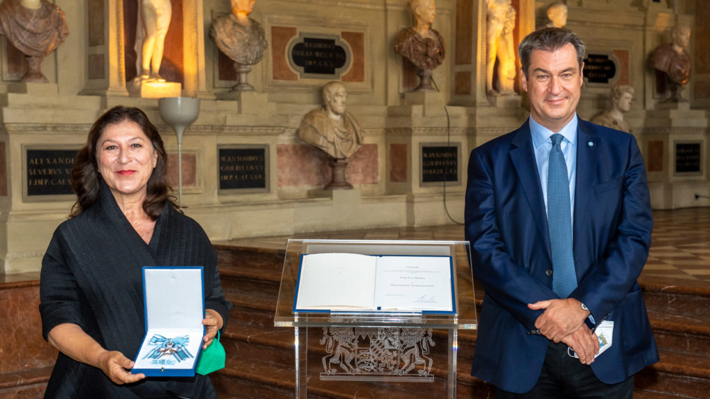 Bayerns Ministerpraesident Markus Soeder verleiht am Donnerstag (08.07.21) in der Residenz in Muenchen den Bayerischen Verdienstorden an Eva Mattes.