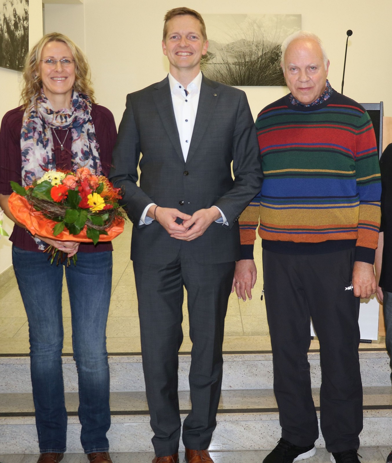 Bürgermeister Simon Frank eröffnete vor einigen Gästen eine Ausstellung mit Werken von Melanie Stiebich (links) und Michael Frinker (rechts) in allen Räumen des Aschauer Rathauses.