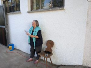 Christian Eckler  machte es dann erfreulich kurz. Er freute sich über die vielen Besucher. Die Atmosphäre eines ehemaligen Kuhstalls als Ausstellungsort habe ihn besonders gereizt, denn hier kann er seine Aquarelle in einem Ambiente zeigen, das eine gewisse Verbindung zur freien Natur hat.  Auslösender Impuls sei für ihn das Sehen und Erleben. Eckler wies dann noch darauf hin, dass auf der rechten Seite des Stalls Bilder aus deutschsprachigen Ländern sind und auf der linken Seite Bilder aus fremdsprachigen Ländern. Als Besonderheit hatte er für den Abend ein Bilderrätsel vorgesehen, bei dem man von 12 Bilderausschnitten die Herkunft erraten musste und die Chance hatte, ein Original seiner Werke zu gewinnen.