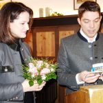 Traunsteins amtierender Landrat Siegfried Walch überreicht einen Blumenstrauß und das Buch „Der Volkstribun mit dem Gamsbart“ über den ehemaligen Ruhpoldinger Land- und Reichstagsabgeordneten Georg Eisenberger, den „Hutzenauer“ an die Bayerische Staatsministerin Michaela Kaniber zum Dank für ihr Kommen.