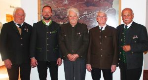 Vorstand Heinrich Rehberg (rechts) und sein Stellvertreter Georg Kronast (links) zeichneten als letzte Amtshandlung beim Veteranenjahrtag in Wildenwart Christian Stocker (25), Konrad Huber senior (50) und Josef Fischer (50) mit dem Verdienstabzeichen des Wildenwarter Veteranenvereins aus.