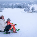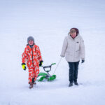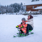 Die frische Schneedecke auf dem Samerberg lädt zu winterlichen Aktivitäten ein. Eine Mutter mit ihrem Sohn sausen den Hang hinunter, die kalte Winterluft wirbelt um sie herum, und fröhliche Schreie hallen durch die verschneite Landschaft. Beide erleben gemeinsam den Nervenkitzel des Rodelns, während sie sich den Hang immer wieder hinaufziehen, um die Abfahrt zu wiederholen.