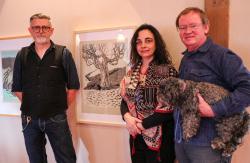 Wie vielschichtig die Arbeiten des Künstlers sind und wie die auch technisch anspruchsvollen Werke entstehen, erklärte und zeigte der Künstler im Anschluss an die herzliche Begrüßung den zahlreichen Kunstinteressierten, die zur Vernissage gekommen waren. Piekar erklärte begeistert, dass seine Bilder, je nach Motiv, aus bis zu 50 verschiedenen Farbebenen bestehen, die zunächst von ihm gezeichnet, auf Linolschnittplatten übertragen und dann auf Papier gedruckt werden. So entstehen Schicht für Schicht einzigartige Werke, die die Vielfalt und Schönheit des Böhmerwaldes widerspiegeln.