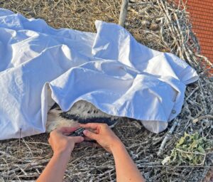 Geschützt unter einer Decke bekamen die vier Jungstörche ihre Erkennungsringe angelegt. (Foto: Markus Schmidberger)