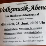 Am Mittwoch, 25. Juni, findet um 20 Uhr im Rathaus-Klostersaal in Fischbachau ein Volksmusik-Abend statt. Musikliebhaber können sich auf Darbietungen von Oidhoizklang, Oberauer Dreigesang, Oberroaner Musi und dem Duo Hierl-Dicker freuen.