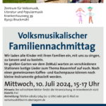 Wir wollen die Tradition der früheren Familiennachmittage im VMA wiederaufleben lassen und laden alle Kinder samt ihren Familien ein, an diesem Nachmittag mit Kathi Bucher und Steffi Wagenstaller zu singen, zu tanzen und zu basteln. Im großen Garten vor dem ZeMuLi werden an verschiedenen Stationen Lieder zum Thema Bauernhof gesungen. Nach einer gemeinsamen Kaffee- und Kuchenpause können noch kleine Instrumente gebastelt werden.