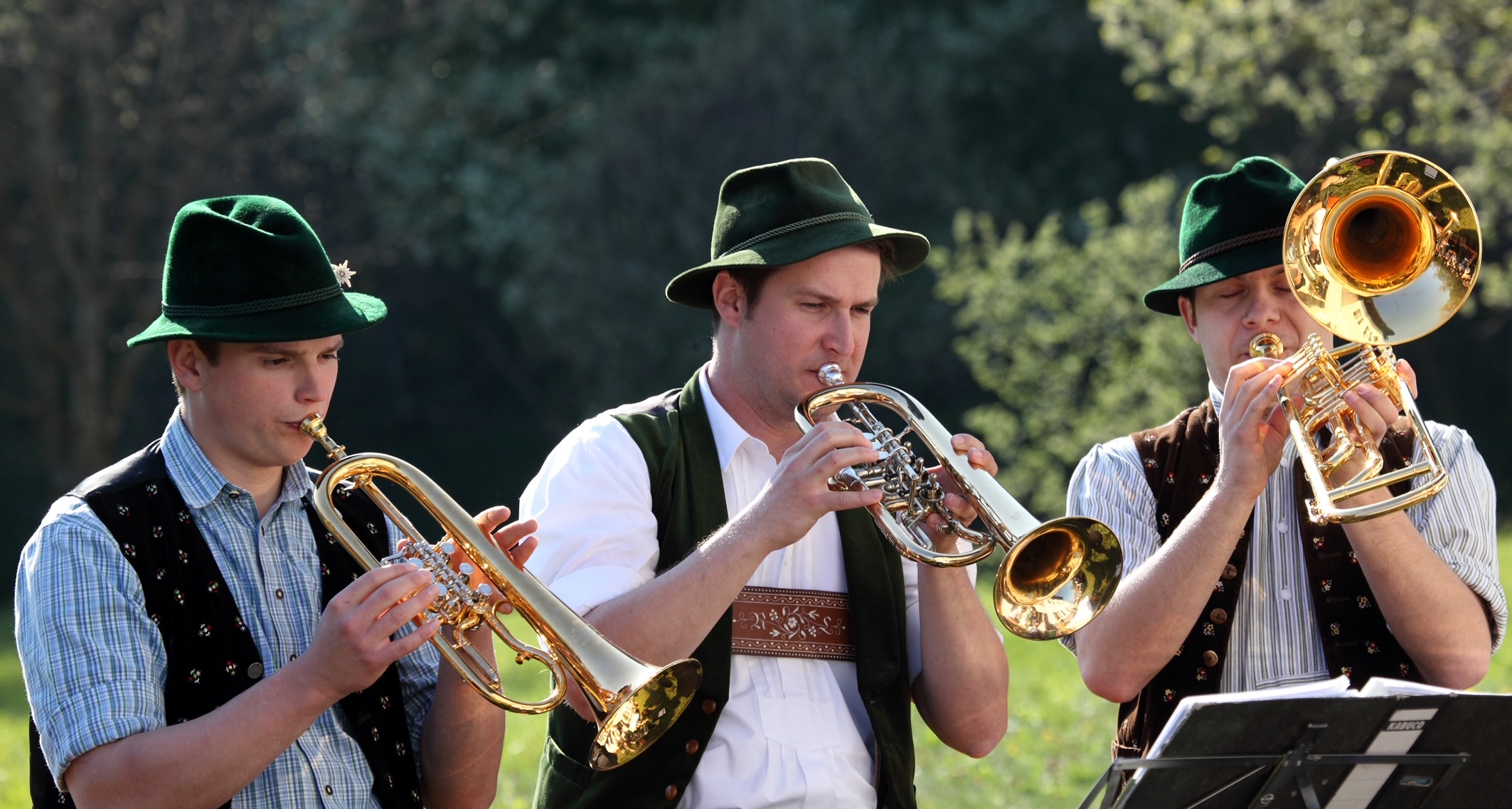 Aufgehorcht: Blechbläser machen Stimmung auf der Wiese am Häuslmannhof aus Aschau im Chiemgau. © Bezirk Oberbayern, Archiv Bauernhausmuseum Amerang, Aufnahme: Gerhard Nixdorf.