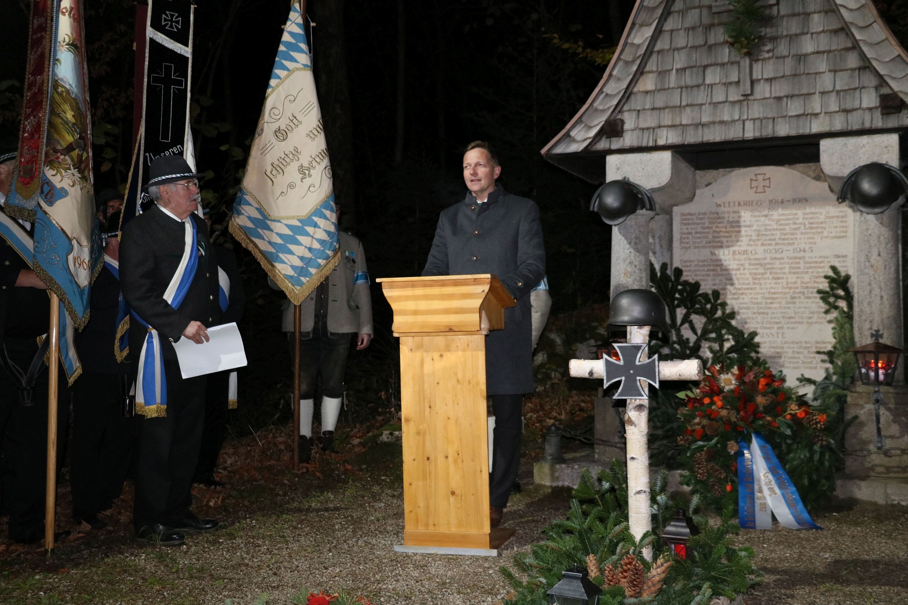 Bürgermeister Simon Frank bei seiner Ansprache am Kriegerdenkmal beim Sachranger Volkstrauertag