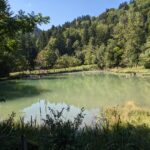 Nachdem wir unseren Durst gelöscht und uns mit einer Brotzeit gestärkt haben, laufen wir gemütlich auf breiten Almstrassen durch schattigen Wald und vorbei an einem idyllischen Weiher, zurück nach Adersberg.
