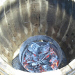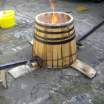 Dann folgt der wichtigste Schritt des Fassmachens – das biegen der Dauben. Hierfür werden weitere Eisenreifen auf die stehenden Bretter aufgezogen und in der Mitte des Fasses ein Holzfeuer entzündet, welches die Dauben biegsam macht. Wichtig ist dabei, dass die Bretter an der Außenseite laufen nass gemacht werden. Durch die entstandene Biegsamkeit werden die Dauben am anderen Ende mit Hilfe eines Fasszuges zusammengezogen. Danach wird das Fass gedreht und entsprechend bereift und darf erstmal abkühlen. Nach einem Tag Ruhepause kommt das Nachfeuer und Rösten auch Toasten genannt. Beim Nachfeuern werden die inneren Spannungen der Fassdauben minimiert und der Grad der Röstung (leicht/mittel/stark) bestimmt – diese beeinflusst später den Geschmack des gelagerten Gutes. Im vorletzten Schritt werden dann die Fassdeckel und -böden hergestellt und eingesetzt und zu guter Letzt wird das Fass noch gehobelt und geschliffen und das Spundloch gebohrt.