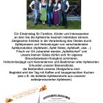 Bei diesem Erlebnistag für Familien, Kinder und Interessenten ist es möglich, die Apfelernte hautnah mitzuerleben. Man erhält zeitgleich Einblick in die Verarbeitung des Obstes durch Apfelpressen und Verkostungen von verschiedensten Apfelprodukten (Apfelwein, Apfel Gelee, Apfelsaft, usw…). Frisch vor Ort zubereitet werden „Apfelkücherl” und die kleinen Gäste dürfen sich ihr eigenes Streuobstwiesen-Honigbrot schmieren. Es wird zudem eine Hofschnitzeljagd zum Kennenlernen und Bestimmen alter Apfelsorten geben. Des Weiteren können die Bienenstöcke erkundet werden, die Bestandteil des Obstgartens sind. Begleitet wird der Tag mit Kaffee und hausgemachten Kuchen (wie z.B. die beliebte Apfelweintorte aus dem selbstproduzierten Apfelwein).