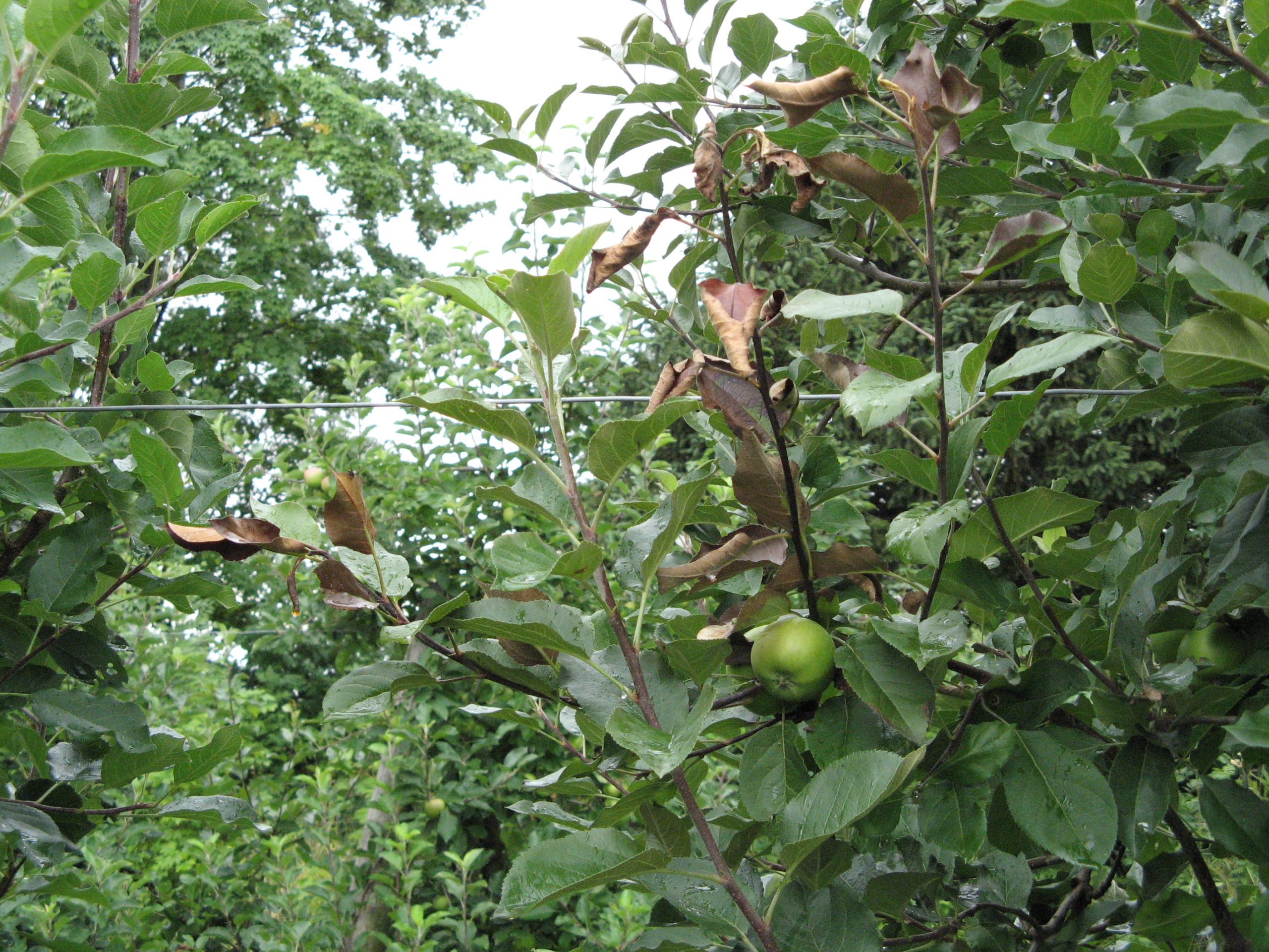 Feuerbrandbefall an Apfel in einer Erwerbsobstanlage. (Eva Satzl / LfL)