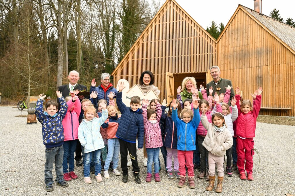 Das Foto zeigt Forstministerin Michaela Kaniber (Mitte) gemeinsam mit Kindern des Evangelischen Kindergartens „Unterm Regenbogen“ Emmering vor dem neu gebauten Walderlebniszentrum. Pia Regnet / StMELF honorarfrei
