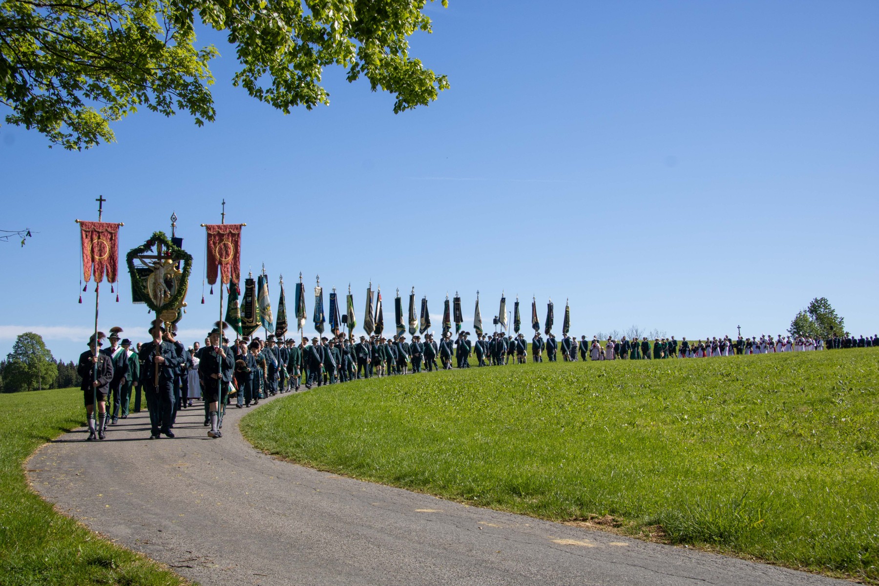 Wallfahrtszug zur Wieskirche: Betend und Singend zusammen mit Wieskurat Florian Geis sowie von dem ehemaligen Wiespfarrer, Prälat Georg Kirchnmeir ziehen die Trachtler zur Wieskirche