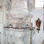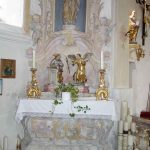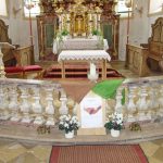 Die erfreuliche Botschaft der aktuellen Mittelbewilligung konnten Kirchenpfleger Heinrich Dhom und Kirchenverwaltungsleiterin Dagmar Hunger im Beisein von Pfarrer Claus Kedinger vom Pfarrverband Riedering sowie den Vertretern des nach einer Ausschreibung mit den weiteren Arbeiten beauftragten Architekturbüros bekanntgeben. Den Projekt-Zuschlag bekam die Firma Krug Grossmann Architekten aus Rosenheim, dessen Geschäftsführer Stefan Lippert und seine Architektin Birgit Ströbitzer nunmehr die nächsten und weiteren Maßnahmen bei einem Vor-Ort-Termin besprachen. Bereits seit mehreren Jahren wurden in Abstimmung mit dem kirchlichen Kunstreferat Feuchteschäden an den beiden bröselnden Seitenaltären festgestellt und gutachterlich untersucht. Damit verbunden war eine geplante liturgische Neugestaltung des Altarraumes mit Altartisch, Ambo und Kommunionbank. Hierfür fertigte der betagte Rosenheimer Bildhauer Josef Hamberger als sein letztes Werk vor seinem Tod Entwürfe für das ihm persönlich sehr vertraute Gotteshaus an.