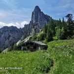 Variante für Fotofreunde: Sollten wir noch einen Blick über die schön gelegene Hörndl-Alm (nicht bewirtschaftet) mit der Hörndlwand werfen wollen, so müssen wir eine gute Stunde auf angenehmen Steig leicht bergauf wandern (siehe Wegweiser beim unteren Almgebäude).