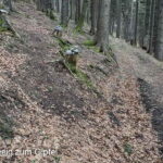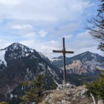 Hier beginnt der Aufstieg zum Schortenkopf. Es gibt weder Markierungen noch einen Wegweiser. Links vor dem Gatter führt ein breiter, oft matschiger Karrenweg mit tiefen Furchen bergauf. Auf diesem steigen wir ca. 340 Meter empor. Dann zweigt rechts ein schmaler Weg ab. Auch hier gibt es keine Markierung, aber mehrere kleine Steinmänner (siehe Bild “Abzweigung Steig zum Gipfel”). Der Steig, immer wieder durch Steinmännchen markiert, verläuft direkt dem Gipfel entgegen. Kurz vor dem höchsten Punkt wenden wir nach rechts und stehen plötzlich vor dem Gipfelkreuz. Vorsicht, hier geht es steil nach unten!