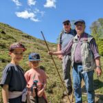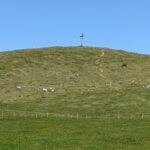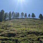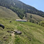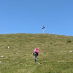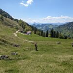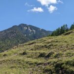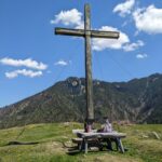 Wir erreichen die Gebäude der Schachenalm, die nicht bewirtschaftet ist. Der letzte Anstieg ist kurz, aber lohnend. Oben angekommen begrüßt uns ein großes Gipfelkreuz, davor eine Bank mit grandiosem Panorama. Die Sicht reicht weit – über grüne Täler, Wälder und schneebedeckte Gipfel am Horizont. Wir lassen uns Zeit, genießen Brotzeit und Aussicht, bevor wir für den Rückweg den etwas längeren, aber nicht ganz so steilen Weg hinunter nach Huben nehmen und dann auf dem Radweg zurück zum Auto wandern..