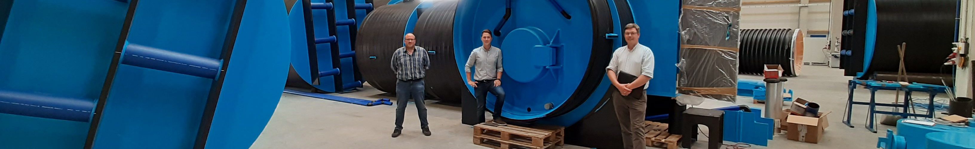 Es geht zügig weiter mit dem Bau der Trinkwasserversorgung im Bereich des Ortteiles Staffelstein auf der Kampenwand. Für die Versorgung der Steinling-Alm und der am Versorgungsstrang anliegenden Almen und Hütten wurde jetzt in Wölfersheim bei Frankfurt ein Trinkwasserbehälter gebaut. Florian Sollfrank vom Bauamt Aschau, der Wassermeister der Gemeinde Peter Graf und Johannes Höglauer vom Ingenieurbüro Dippold & Gerold fuhren zur Werksabnahme nach Wölfersheim. Der Wasserbehälter aus Polyethylen-Kunststoff wird derzeit von der Firma Frank Kunststofftechnik aus Wölfersheim bei Frankfurt am Main gefertigt. Der Behälter wird Anfang August in drei Teilstücken, bestehend aus einer Schieberkammer und zwei Wasserkammern auf der Straße bis Aschau angeliefert, auf der Forststraße zu seinem Bestimmungsort oberhalb der Steinlingalm gebracht und dort vor Ort final zusammengeschweißt. Mit den Baggern an der Baustelle wird der komplette Behälter schließlich im Boden versenkt und befüllt. Der gesamte Behälter wiegt – natürlich ohne Wasserfüllung – etwa fünf Tonnen. Mit einem Fassungsvermögen von sechs Kubikmetern, ist die Versorgung aller Leitungsanlieger mit Trinkwasser auch in Spitzenzeiten gewährleistet.