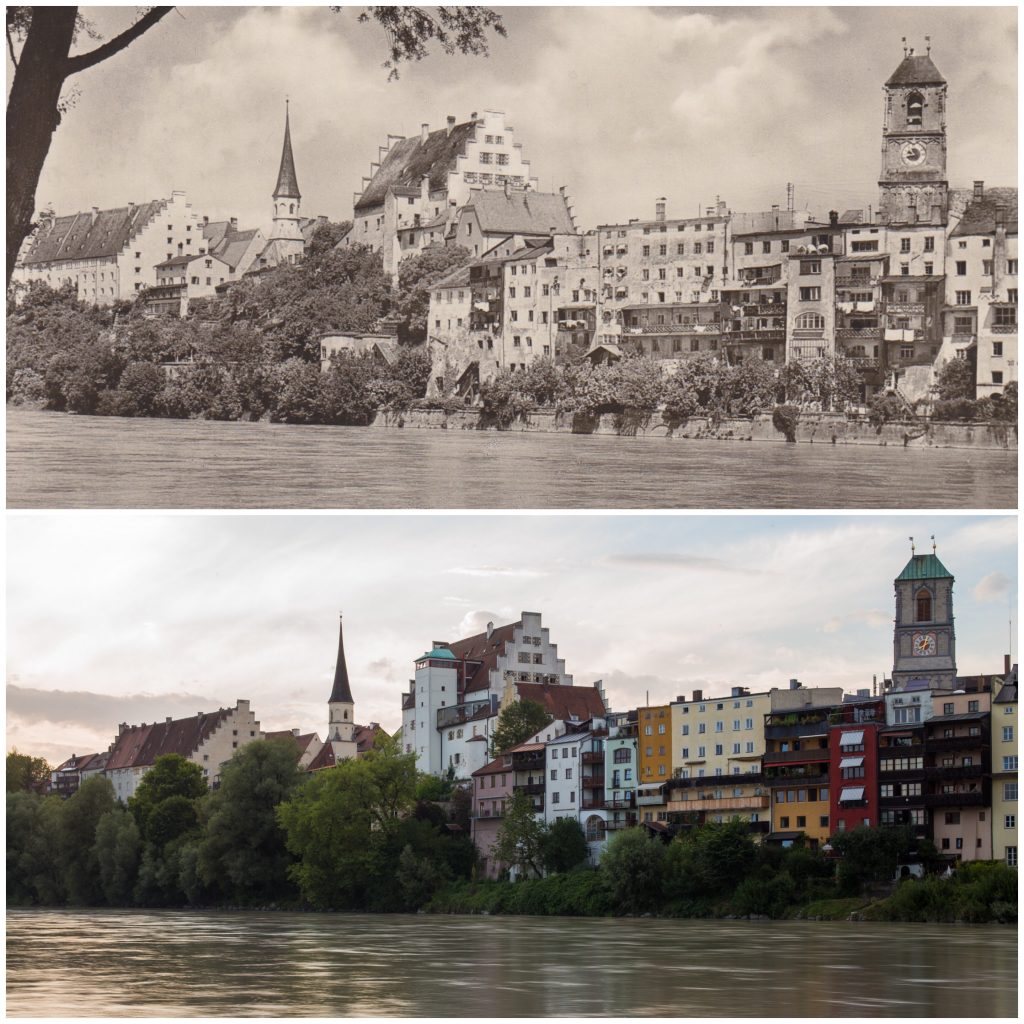 Wasserburg im Jahr 1940 zeigt eine alte Aufnahme von einem Foto-Sammler aus Rheinland. Durch Zufall habe ich die gleiche Aufnahme-Perspektive letztjährig aufgenommen, so dass ich hier eine interessante Gegenüberstellung beider Fotos zeigen kann. Beide Aufnahmen zeigen das Beständige und den Wandel in den letzten 80 Jahren…In der ehemaligen Wasserburg befindet sich heute ein Seniorenheim (Altenheim Maria Stern). Auf beiden Aufnahmen rechts gut zu sehen ist der Turm der katholische Stadtpfarrkirche St. Jakob, eine spätgotische Backsteinkirche, die ursprünglich eine Filialkirche der Benediktinerabtei Attel war und im Jahr 1255 erstmals erwähnt wurde. Sehenswert bei einem Wasserburg-Besuch ist die Kanzel dieser Kirche. Sie wurde von Martin und Michael Zürn dem Älteren aus Waldsee im Jahr 1638 geschaffen und ist gut erhalten. Näheres dazu finden Sie auch in meinem Buch “Wasserburg am Inn”, das im letzten Jahr im Rosenheimer Verlagshaus erschienen ist (hier).