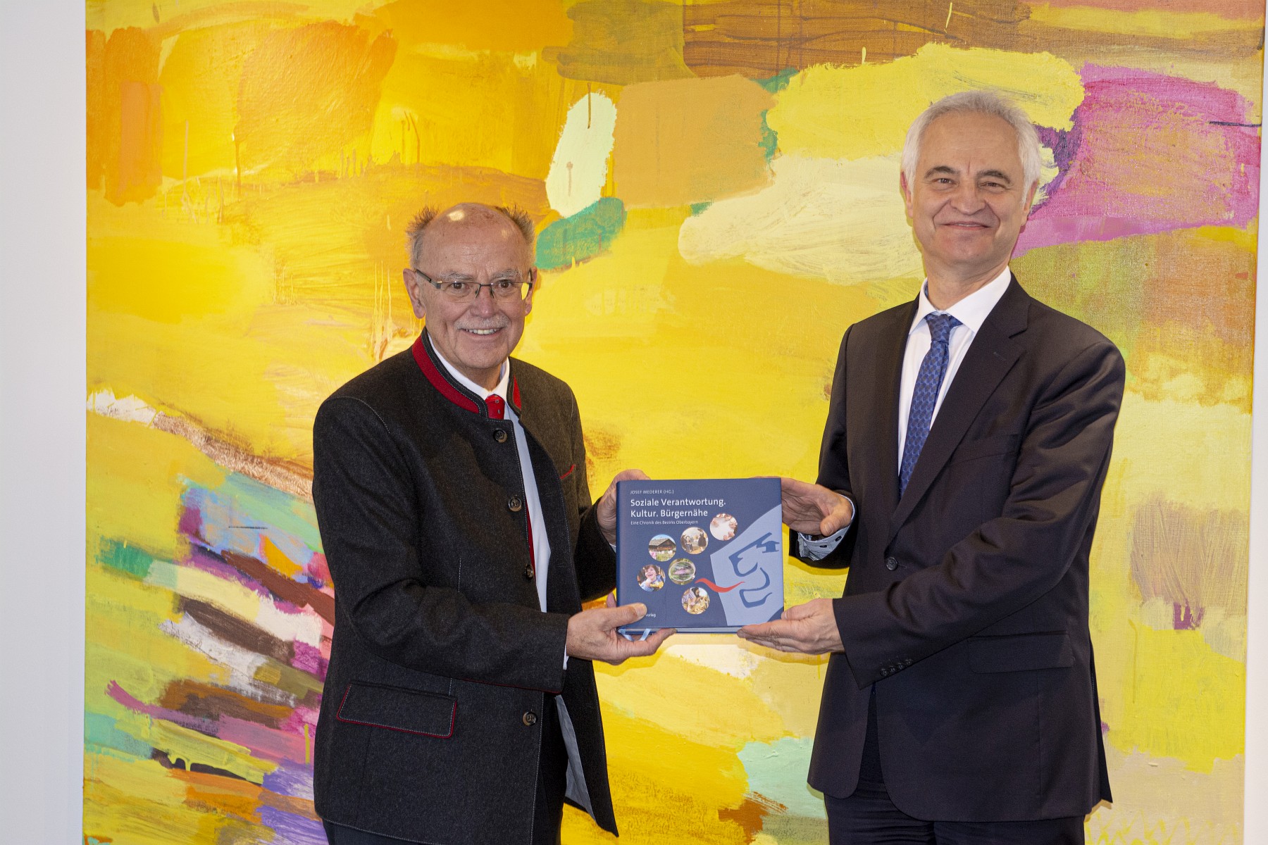 Zum Antrittsbesuch begrüßte Bezirkstagspräsident Josef Mederer den neuen Regierungspräsidenten Dr. Konrad Schober (rechts) im Bezirk Oberbayern. Mederer überreichte ihm die Chronik des Bezirks.