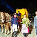 Wie in der guten alten Zeit: Die Weihnachts-Moderatoren Traudi Siferlinger und Dominik Glöbl sind mit der Postkutsche nach Söllhuben, Gemeinde Riedering gekommen und zwischen dem „Hirzinger“ und der letzten Kirche, die der Barockbaumeister Johann Michael Fischer (Marienmünster zu Dießen) noch geplant hatte, ausgestiegen. Foto BR-Fernsehen