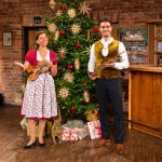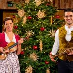 Traudi und Dominik beim Andachtsjodler vor dem Wirtshausmusikanten-Christbaum, ím bairischen Stil traditionell geschmückt.