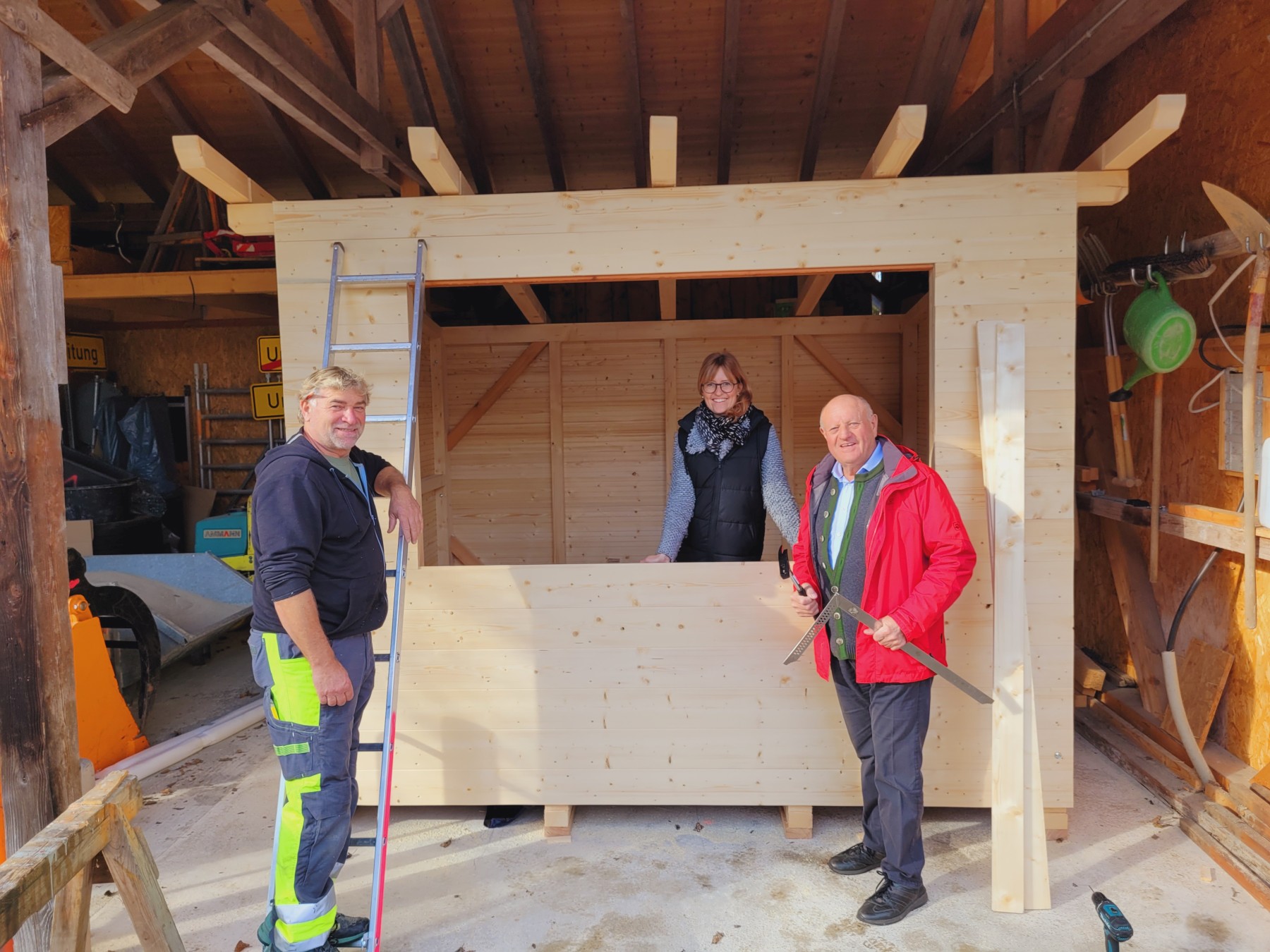 Bürgermeister Christian Glas, die Leitung der Tourist-Info Julia Hausmann und Bauhofleiter Wast Weber inspizieren die neuen Weihnachtshütten und freuen sich schon auf das 2. Adventswochenende (v.r.n.l.).
