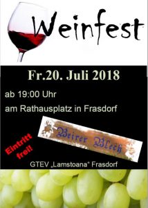 Zu einem gemütlichen Weinfest lädt der Trachtenverein „Lamstoana“ am Freitag, 20. Juli nach Frasdorf ein. Beginn ist bei freiem Eintritt um 19 Uhr am Rathausplatz, es spielt die Kapelle „Beirer Blech“.