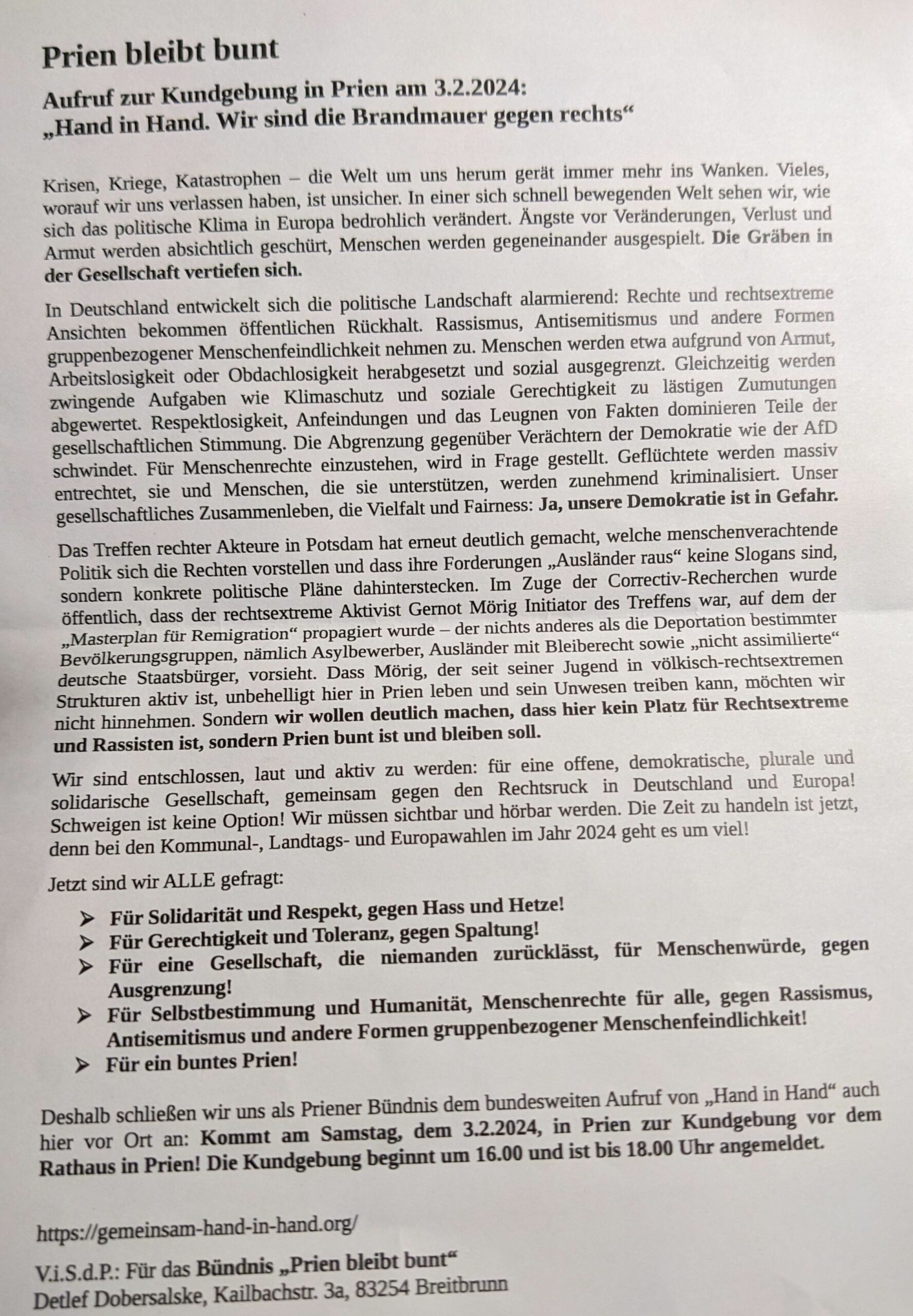 Aufruf vom Bündnis “Prien bleibt bunt”