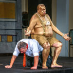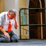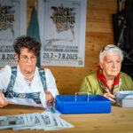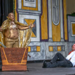 Wenn das Gold das Sagen hat … Mit goldglänzendem Körper, dicker Rolex-Kette und überheblichem Grinsen thront „Mammon“ (Markus Leitner) auf dem gekrümmten Rücken von „Jedermann“ (Bernd Eutermoser) – eine Szene, die ebenso grotesk wie entlarvend wirkt. Sie zeigt, wie sehr sich der Mensch dem Reichtum unterwirft, wie tief er sich beugt, wenn das Geld das Sagen hat. Die Inszenierung des „Bayerischen Jedermann“ auf dem Neubeurer Marktplatz spart nicht an drastischen Bildern – und genau das macht ihre Kraft aus. Mit bissigem Humor und scharfer Symbolik bringt das Ensemble die großen Fragen von Leben, Tod und moralischem Verfall mitten ins Hier und Jetzt. Markus Leitner überzeugt als überzeichnet materialistischer Mammon ebenso wie Bernd Eutermoser als innerlich zerrissener Jedermann – ein fesselndes Spiel zwischen Abhängigkeit und Selbsterkenntnis.