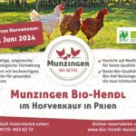 Die Möglichkeit, frische Naturland Bio-Hendl zu erwerben, ergibt sich am Freitag, 21. Juni 2024, beim nächsten Hofverkauf. Damit jeder die Bio-Hendl sicher bekommt, wird eine Reservierung empfohlen. Eine Vorbestellung ist unter der Telefonnummer 0170-8036213 oder auf der Website www.bio-hendl-munzinger.de möglich.