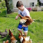 „Lisa, Susi, Adele, Berta, Cilly komm komm komm“, flügelschlagend läuft, rennt und stolpert ein Dutzend braune Hühner daher, ein Pfiff hat sie aus ihrer Ruhe aufgeschreckt. Sie verlassen ihre Sandbäder und ihren Unterstand unterm großen Apfelbaum und versammeln sich rund um Florian, der da gepfiffen hat. Der 13-jährige hat ihnen ein paar Leckerbissen mitgebracht, ein paar Brocken Brot – stibitzt aus Omas Speisekammer – und eine Handvoll Sonnenblumenkerne, langsam hockt er sich nieder. Er kennt jede einzelne von den zwölf Hühnern: „das ist die Lisa, das ist die Gescheiteste von allen, das ist Adele, die ist immer hungrig, das ist die Susi, dahinten kommen Hanni und Nanni, die beiden gesperberten, die sind ein bisschen scheu. Alle zwölf haben ein anderes Gesicht, haben einen anderen Schnabel und einen anderen Kamm, oder sie tragen ihre Federn anders, man kann sie ganz leicht voneinander unterscheiden“. Er bleibt in der Hocke und ohne zu zögern springt ihm Lisa aus dem Stand auf den Unterarm und pickt die Sonnenblumenkerne aus der anderen Hand, die anderen elf drängen sich um die Knie und wollen auch etwas. Lediglich Hannibal der Hahn hält sich etwas abseits, ihm ist nicht ganz geheuer, was seine Damen mit dem Buben alles machen.