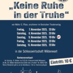 Das Stück „Keine Ruhe in der Truhe“ stammt von Walter G. Pfaus und ist im Deutschen Theaterverlag erschienen. Aufgrund der bisherigen stets gewachsenen Nachfragen für die Theatervorstellungen in Wildenwart gibt es heuer erstmals fünf Aufführungsabende, diese sind am Freitag, 7. November, am Samstag, 8. November, am Freitag, 14. November und am Samstag, 15. November jeweils ab 20 Uhr. Neu ist eine weitere Aufführung am Sonntag, 9. November bereits ab 19 Uhr. Der Kartenvorverkauf für alle fünf Veranstaltungen beginnt am Samstag, 18. Oktober von 9 Uhr bis 10 Uhr in der Schlosswirtschaft. Weitere Karten sind dann ab Montag, 20. Oktober bei EDEKA Irob in Prutdorf, Telefon 08051-4108 erhältlich. Restkarten sind dann auch noch an den Veranstaltungsabenden eine Stunde vor Vorstellungsbeginn zu bekommen.