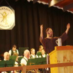 Ehe sich der Prediger mit dem Bayerischen Defiliermarsch auf die Bühne hineinspielen ließ, unterhielt die Wildenwarter Blaskapelle als Gastgeber mit Marsch- und Stimmungsmusik die Besucher. Zu diesen gehörten Rosenheims Landrat Otto Lederer, Kreisrat Helmut Freund, Frasdorfs Bürgermeister Daniel Mair, Priens Bürgermeister Andreas Friedrich, altbewährte und frischgewählte Gemeinderäte aus Prien und Frasdorf sowie zahlreiche Alt-Musikanten und Musikanten-Kollegen aus der Region. Ein besonderer Willkommensgruß galt den vielen Vereinsvorständen, allen voran Vorsitzenden Andreas Willmann vom Wildenwarter Musikförderverein. Das Vereinsgeschehen war dann auch ein erstes Hauptthema von Andi Stoib, er informierte zu den bevorstehenden Jubiläumsjahren: „Heuer feiern in Wildenwart Feuerwehr und Landjugend, nächstes Jahr hoffen wir noch auf ein großes Jubiläum, evtl. von der Mutter-Kind-Gruppe, 2028 haben wir dann wieder das Gautrachtenfest des Chiemgau-Alpenverbandes in Wildenwart und ein Jahr später feiern dann in Atzing die Feuerwehrler und Trachtler gemeinsam“. Zum 125. Trachtlerjubiläum in Wildenwart 2028 mit dem dann 90. Gaufest ergänzte er: „Trachtler-Kaiser Helmut Freund wird bei diesem europäischen Großereignis von den Festleitern Thomas Stoib und Markus Irob sowie vom allwissenden Vereinslexikon Lambert Huber unterstützt“ und fügte noch hinzu: „Denken wir aber dran, dass zum Feiern nicht nur ein Zelt und das Bier, sondern auch ein Pfarrer dazugehören, noch dazu, weil wir ja im Pfarrverband Westliches Chiemseeufer neu besetzt sind“.