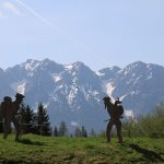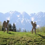 Kaum ist in Sachrang und im Oberen Priental der Schnee verschwunden pirschen sie wieder gemeinsam über die Höhe vor der Kulisse des Zahmen Kaisers in Sachrang. „Schmuggler und Wilderer“ treffen sich 200 Meter vor der bayerisch-tirolischen Grenze südlich des Bergsteigerdorfes Sachrang. „Diese beiden „Berufsgruppen“ gehören einfach zur historischen Identität von Sachrang“, so ihr Schöpfer und geistiger Vater, der Sachranger Holzbildhauer Roland Füssel, „sie sind ein wesentlicher und unverzichtbarer Teil der Geschichte des kleinen Dorfes an der Grenze. Die überlebensgroßen Figuren des schwerbepackten Schmugglers mit dem Rucksack voller Zigaretten, Schokolade und sonstigem Schwärzergut und des Wildschützen mit dem Stutzen am langen Arm und der Gams auf dem Rücken werden noch ein paar Jahre auf diesem Hügel am Südrand des Ortes freistehend positioniert, sie werden schon von weitem zu sehen sein und haben im Hintergrund als Kulisse die Bergkette des Zahmen Kaisers.