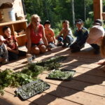 Spannend wurde es, als das Lagerfeuer hergerichtet wurde, um die Kartoffeln auf dem Feuer zu kochen. Die Kinder gingen in den Wald und sammelten Reisig, Marinus vorneweg als Oberfeuerwehrler. In der Feuerschale wurde alles vorsichtig aufgeschichtet und eine kleine Flamme entzündet, die sogleich mit einem passenden Lied begrüßt wurde. Die andere Gruppe machte sich mit Kathi Weiser an das Zerkleinern der gesammelten Wildpflanzen für den Kräuterquark. Eifrig machten sich die Kinder ans Werk. Weitere Kräuter wurden im Mörser zermahlen und später zu Kräutersalz verarbeitet. Auch für einen erfrischen Tee wurden die Kräuter mit dem Messer zerschnitten und mit Wasser versetzt. Später saßen wieder alle Kinder zusammen und haben gemeinsam ihr Wildnis-Mahl verspeist. An diesem Tag haben die jungen Menschen schon viel für ihr Leben in der Natur lernen können!