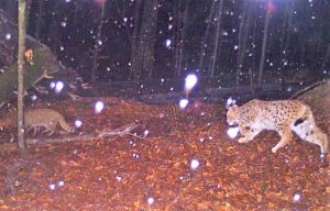 Eine Aufnahme, die im Rahmen des Monitorings gemacht wurde, zeigt eine seltene Situation: Einen Luchs, der einer Wildkatze auf der Spur ist.