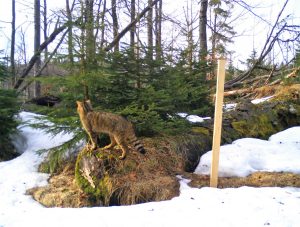 Ein besonderes Augenmerk wird bei dem Projekt, das von November 2020 bis November 2021 läuft, auf die Wildkatze gelegt. Diese Art ist zu Beginn des 20. Jahrhunderts aus dem Bayerischen Wald verschwunden. „In den letzten Jahren kam sie heimlich und zuerst unbemerkt zurück und die ersten Individuen konnten identifiziert werden“, erklärt Heurich. Das Monitoring dieser scheuen Art ist jedoch schwierig. „Sie lebt im Verborgenen, streift meist nachts durch den Wald und hinterlässt kaum Spuren.“ Da die Wildkatze einen wertvollen Teil zum Ökosystem beiträgt, soll ihre Wiederansiedlung dokumentiert werden. „Aber dazu brauchen wir mehr Infos über die existierenden Populationen. Mit Hilfe des Forschungsprojekts können die nun gesammelt werden.“ Damit das Projekt erfolgsversprechender ist, werden in Kombination mit den Kamerafallen angeraute Holzpfähle mit Baldriantinktur besprüht und aufgestellt. „Der betörende Duft lockt die Katzen an und sie reiben sich am präparierten Holz, wobei sie Haare hinterlassen. Diese werden genetisch analysiert und geben einen Einblick in die Population.“ Zusammen mit den Fotos erhalten die Forscher dann wertvolle Daten und einen Überblick über Vorkommen und Populationsgröße.