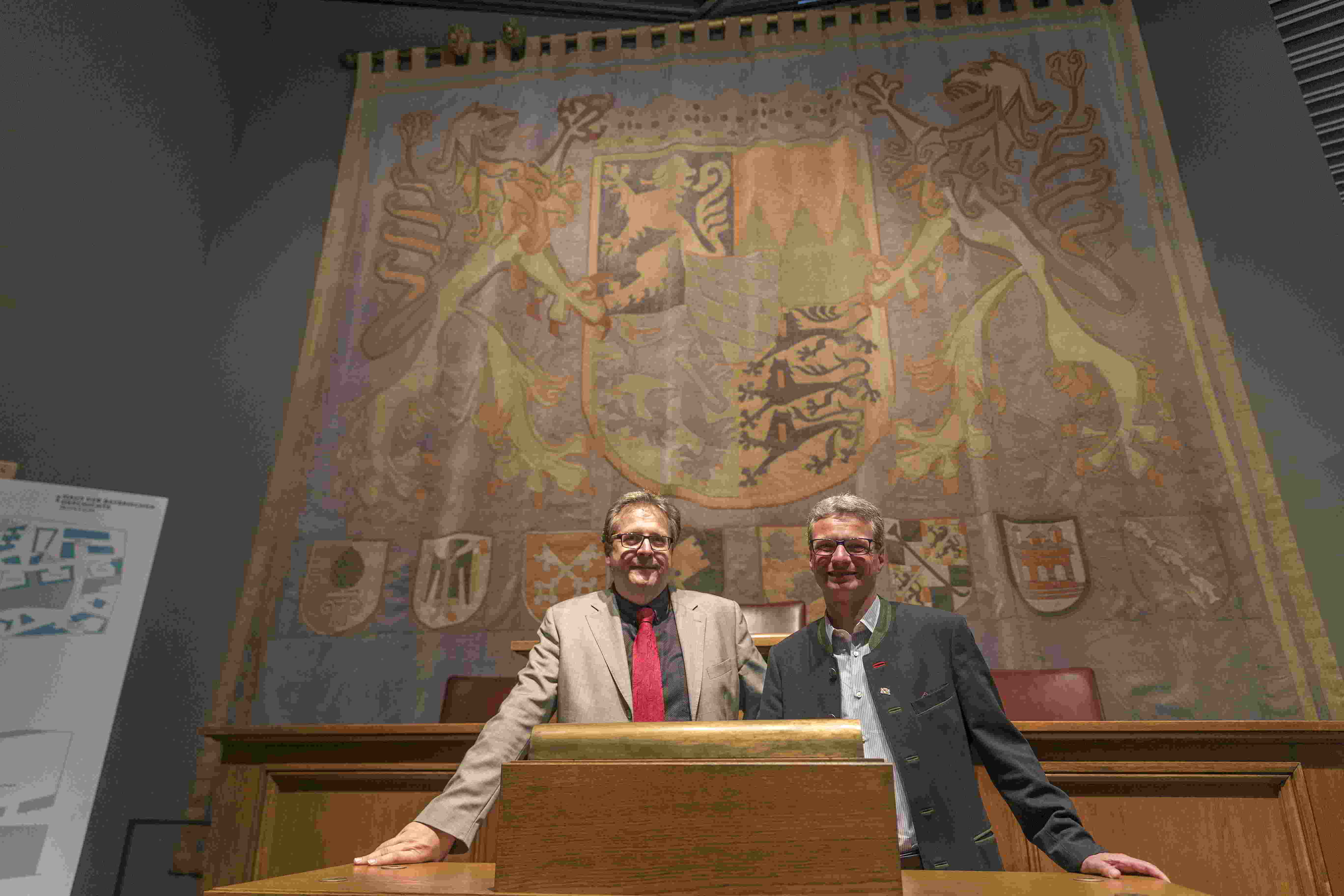 Kunstminister Bernd Sibler und Direktor Dr. Richard Loibl vor dem monumentalen sieben mal sieben Meter großen gewebten Wandteppich, der nach dem Umbau des alten Plenarsaals 2007 in den Senatssaal wechselte und jetzt im Museum des Hauses der Bayerischen Geschichte in Regensburg hängt.
