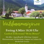 Am Freitag, 8. März um 18.30 Uhr findet im Gasthof Zellerwand „beim Birner“ , Raitener Str. 46, in Schleching/Mettenham ein Wirtshausmusizieren statt. Es spielen Gruppen und Solisten der Musikschule Grassau, mit dabei sind auch die Jugendkapelle Schleching, die Grassauer Klarinettenmusi und die Dochstuimusi.