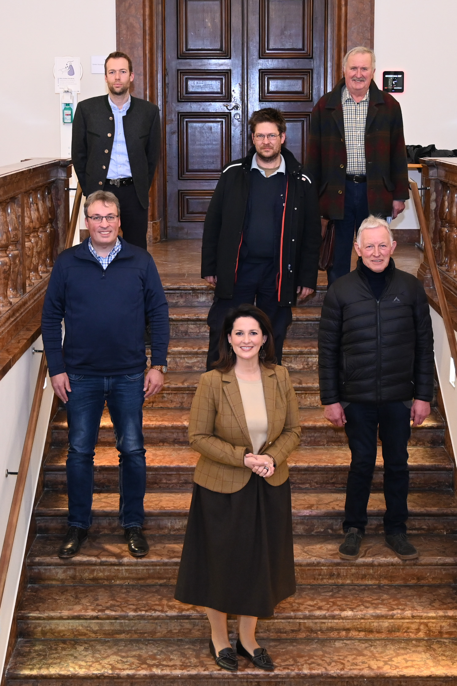 ©Pia Regnet/StMELF (hinten, v.l.n.r.): Martin Bartl (Landesverband Bayerischer Schafhalter), Max Weichenrieder (Vorstand Landesverband Bayerischer ldw. Wildhalter), Roland Kirr (ELF Wolfsbeauftragter Obb.), Michael Hamburger (Stv. ELF Bezirksvorsitzender Obb.), Rupert Staudhammer (ELF Bezirksvorsitzender Obb.), Staatsministerin Michaela Kaniber