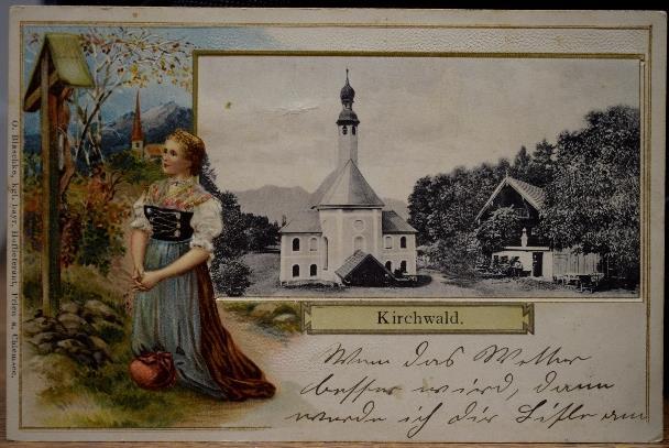 Betende mit Ansicht von Kirchwald, Postkarte, gelaufen 1906 (Gemeindearchiv Nußdorf)