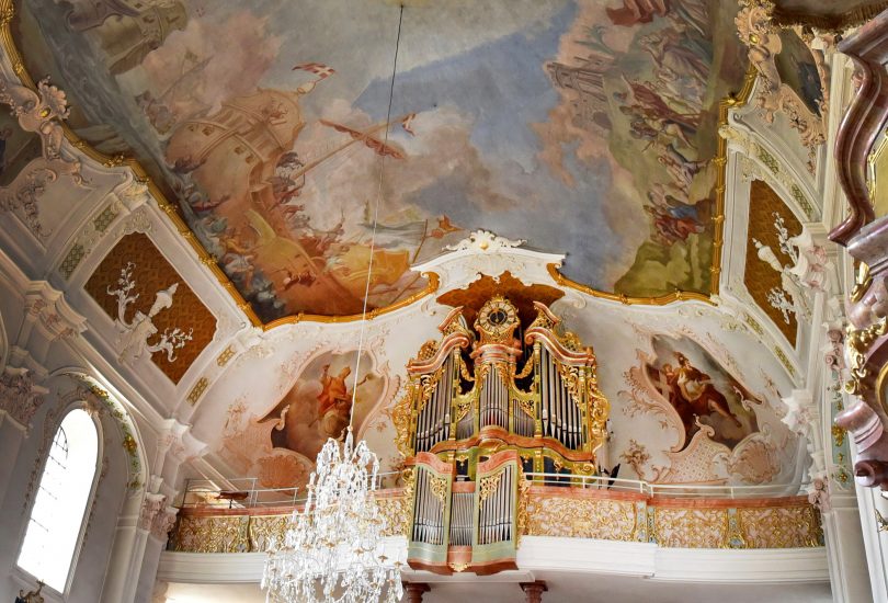 Foto: Blick auf die Orgelempore mit Teilen des Deckengemäldes “Seeschlacht von Lepanto”