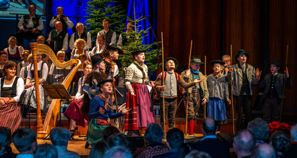 Die Riederinger Hirtenkinder vom Trachtenverein Riedering GTEV Almengrün unter Leitung von Georg „Schoschei“ Staber trugen ebenso auf beeindruckende Weise zur Magie des diesjährigen Rosenheimer Adventssingens bei. Ihre Mitwirkung verlieh dem Event eine authentische Note, die das Publikum tief berührte. Unter dem Motto “Wir spielen nicht, wir sind als Hirten unterwegs” brachten die elf Hirtenkinder ein Stück gelebter Tradition auf die Bühne. Ihr Hirtenspiel präsentierte die Weihnachtsgeschichte auf eine einzigartige Weise, als ob das Wunder der Heiligen Nacht sich direkt im malerischen Chiemgau ereignet hätte. Die Hirtenkinder erzählten und sangen die Geschichte mit einer Mischung aus Leidenschaft und Ehrfurcht. Ihre Darbietungen wechselten zwischen leisen und lauten Passagen, wurden mehrstimmig vorgetragen und von authentischen bayerischen Instrumenten wie Ziach, Flöte und Querpfeife begleitet.