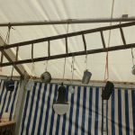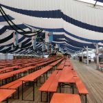 Da in Rottau die Bühne nicht das Zelt halbiert, muss auch für die ersten Veranstaltungen der später abzubauende Teil geschmückt und vor allem auch beleuchtet werden. Also nochmal rauf auf die hohe Leiter und die Kabeln verlegen, Lampen aufhängen. Es ist heiß und dampfig, denn gestern abend gabs einen gscheiden Regenguss. Das Zelt ist dicht. Küchenzelt, Kaffee- und Kuchenbereich und auch die noch wie ein Geheimnis gehütete Bar sind schon mit allem ausgestattet, der Biergarten im Freien und der Toilettenbereich sind mit Hackschnitzeln ausgestreut, Plakate, Preisschilder hängen….